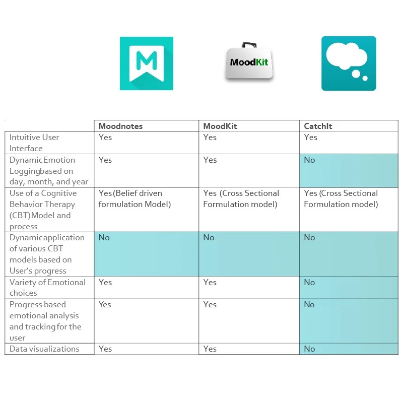 We also conducted an informal competitor analysis to understand what the strengths and weaknesses (user pain points) of other depression apps that existed out there. Based on this, we found four mobile apps which we based the features and user experience of our app from: