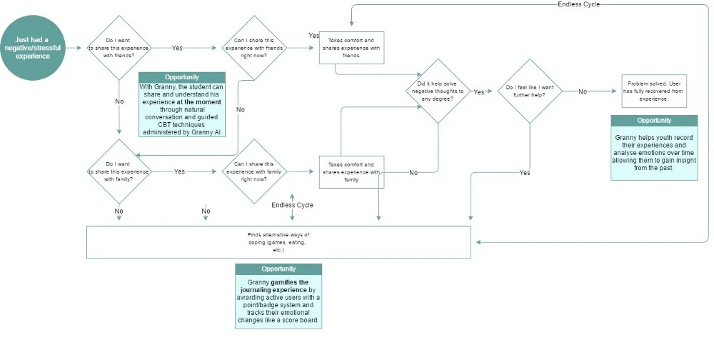 In terms of the UX, the goal was to make it simple and intuitive. Youth should be able to easily see and extract useful information from their experiences and emotions through the data visualizations provided. They should also be able to converse with the Granny avatar as natural as possible in a way that seems like you’re talking with a friend (or your grandma if she’s your friend).