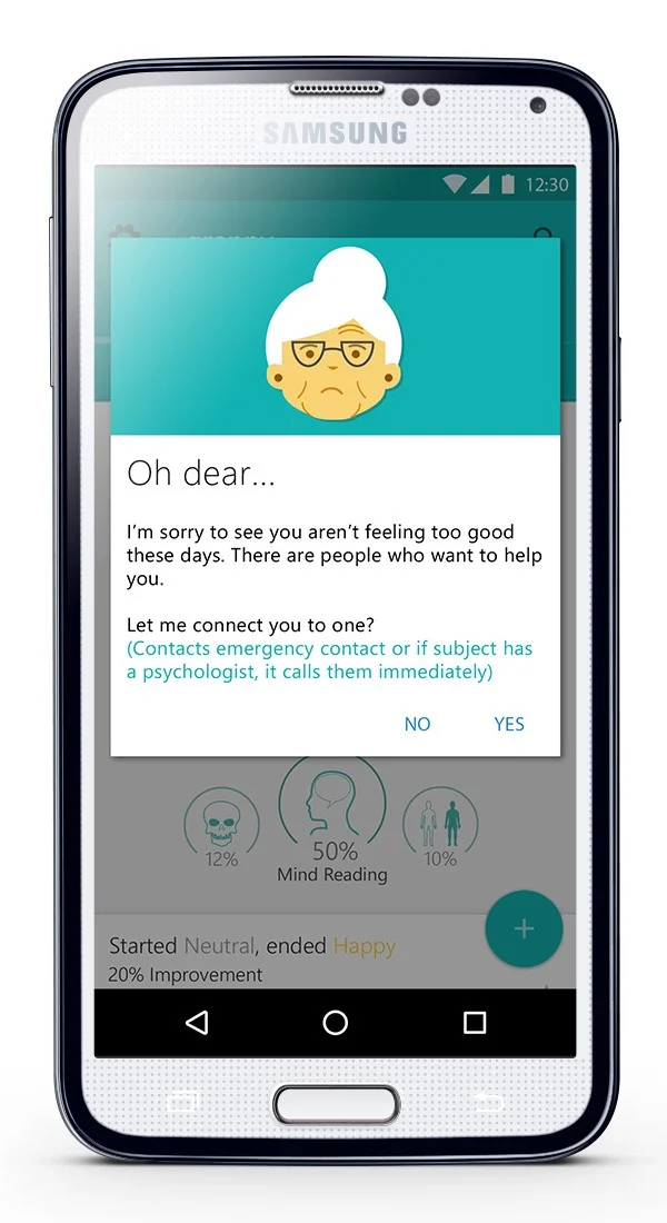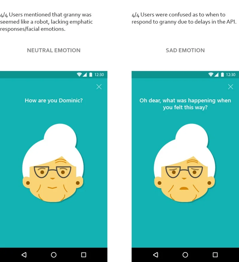 A youth-friendly avatar which mimics the facial emotion of the user through Microsoft’s Facial Emotion API to provide a sense of empathy to aid the natural conversation feature (and based on user surveys, we chose a family member to be the avatar: a Grandma)