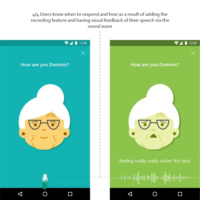 Solution: I modeled this function off the way Apple’s Siri works - containing a microphone which signals to the user that he can speak, a waveform which mimics the user’s voice pitch to allow the user to know he is being recorded/listened to and a beginning and ending audio sound which tells the user that his answer was received. 100% of users were not confused to respond.